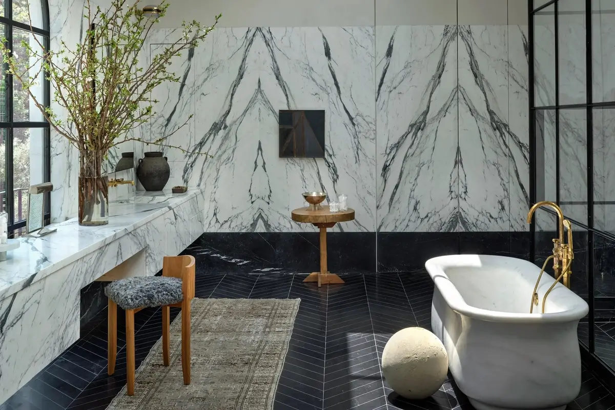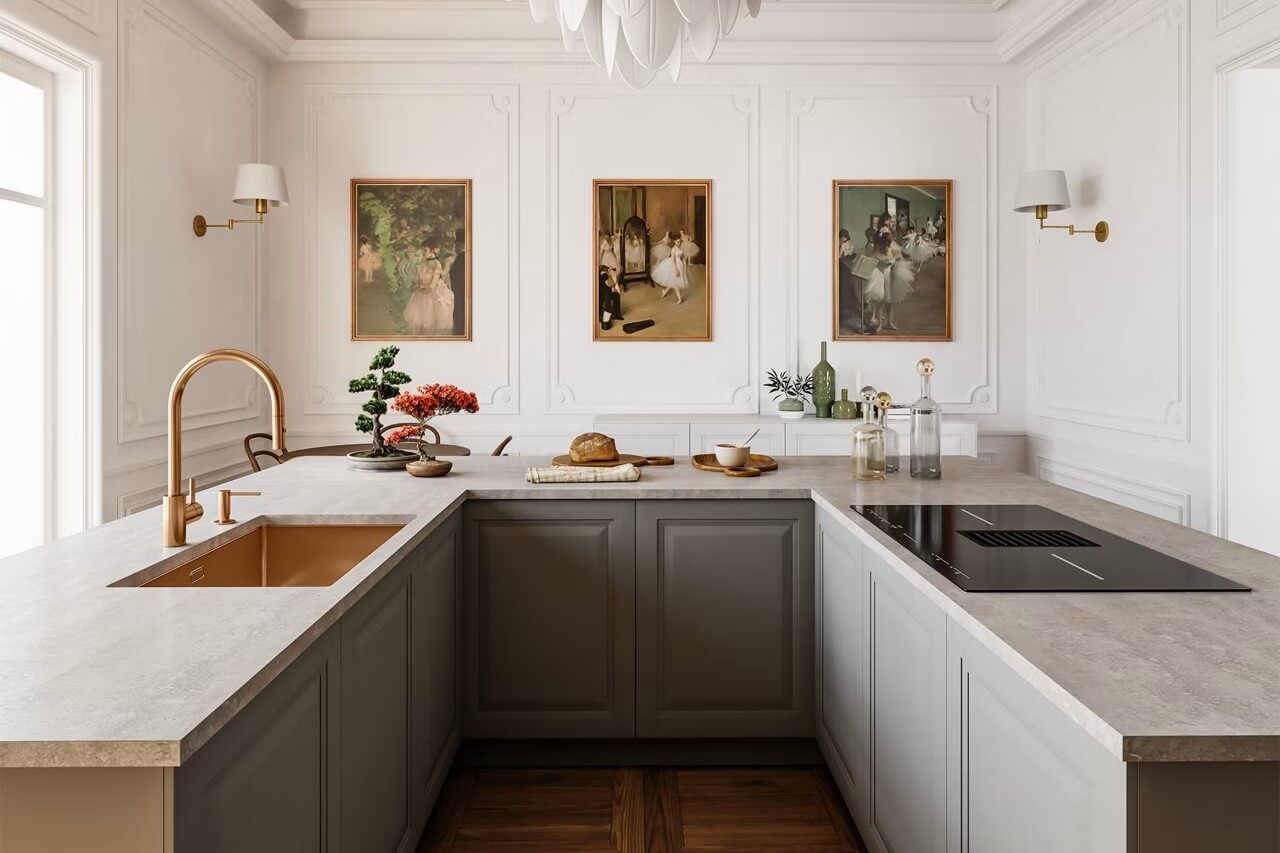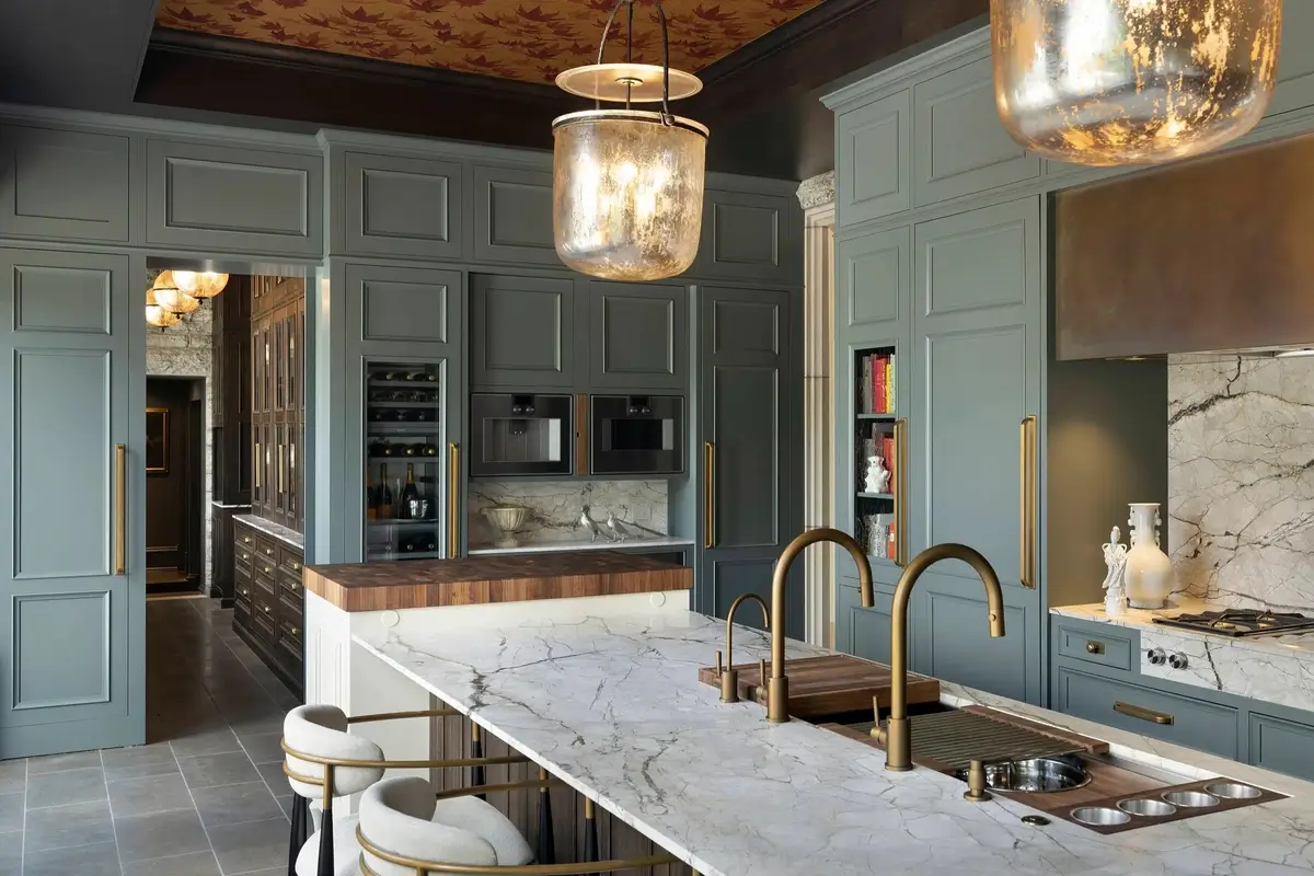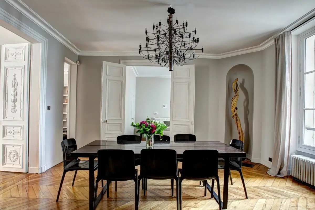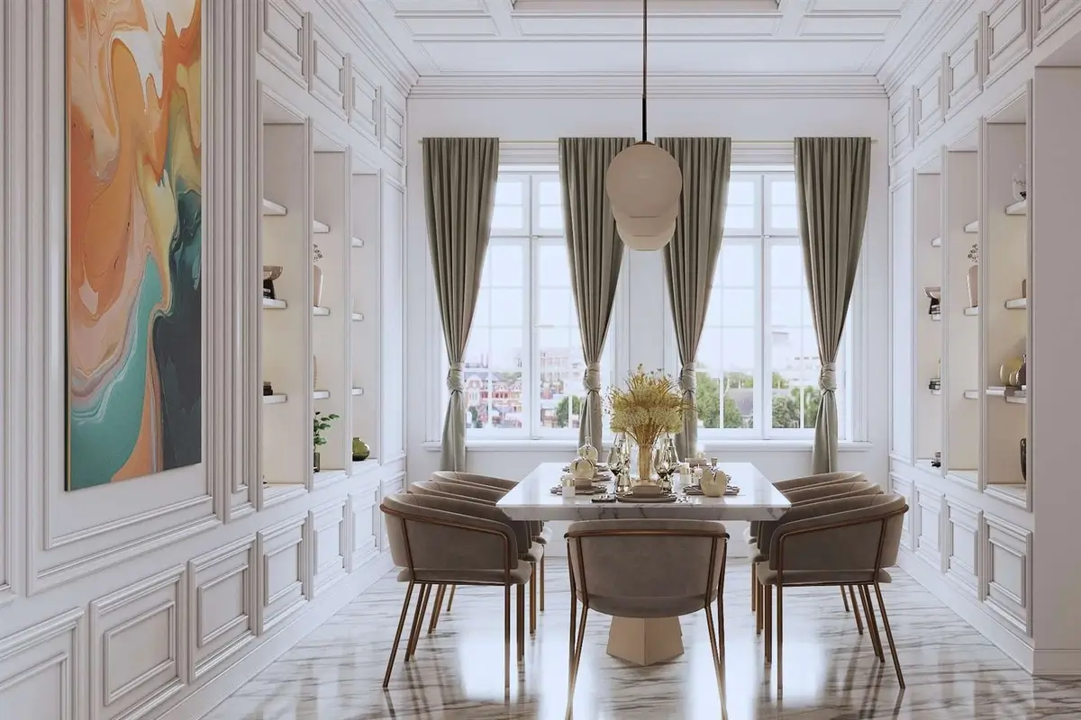 Negli ultimi decenni, questo linguaggio dell’interior design si è evoluto in una versione più leggera e attuale, dando vita al cosiddetto classico contemporaneo, o transitional. Le proporzioni restano, ma cambiano ritmo e intensità: le decorazioni si semplificano, le finiture diventano opache o laccate, le linee più pulite. Le boiserie si riducono a cornici sottili, le superfici lucide si alternano a texture naturali, e gli arredi combinano elementi antichi e moderni con naturalezza. Le grandi tende in velluto lasciano spazio a lini e cotoni neutri, mentre lampade in metallo satinato sostituiscono i tradizionali chandelier.