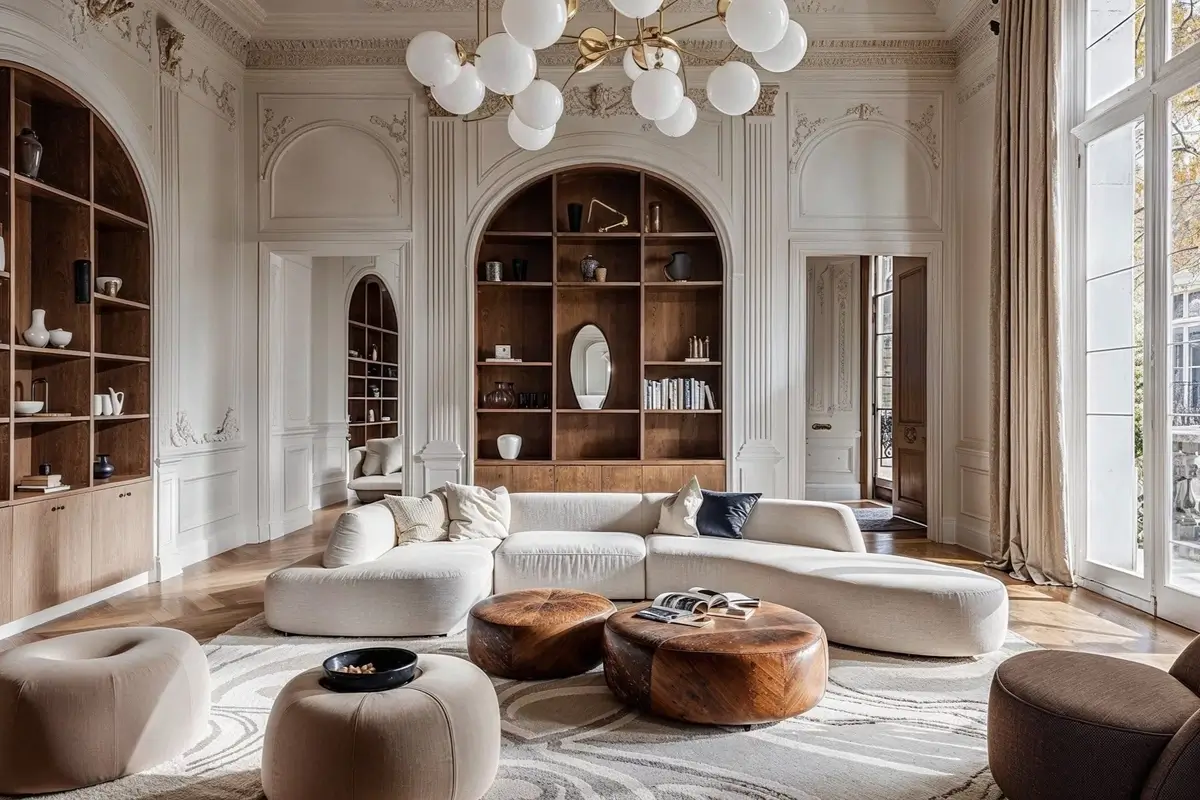 Lo stile classico contemporaneo mantiene la sua impronta signorile, ma con un linguaggio più vicino al gusto attuale: pavimenti in parquet a spina di pesce o in marmo chiaro, palette neutre e desaturate (avorio, greige, grigio perla, caramello) e mix materici tra legno, metallo, vetro e pietra. Le geometrie sono più leggere, i volumi più proporzionati, la luce naturale protagonista insieme a tagli luminosi e punti LED che valorizzano gli arredi.