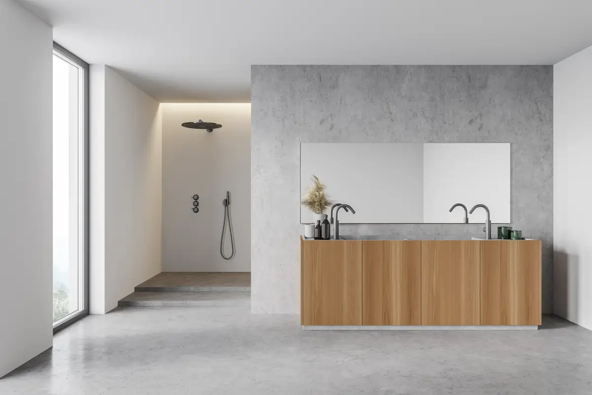 I materiali riflettono la ricerca di purezza: legno naturale, vetro, cemento, acciaio e pietra levigata si alternano in superfici uniformi e tattili. I tessuti, come lino e cotone, mantengono l’atmosfera morbida e respirabile.