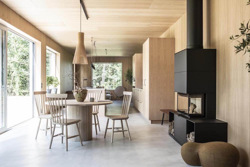 Il legno chiaro è il materiale principale: naturale, caldo e autentico, utilizzato per mobili, pavimenti e dettagli architettonici. Si accompagna a tessuti morbidi e materici come lino, lana e cotone, che aggiungono comfort e tattilità. Le superfici sono semplici, coerenti, mai sovraccariche: l’effetto complessivo è pulito e accogliente.